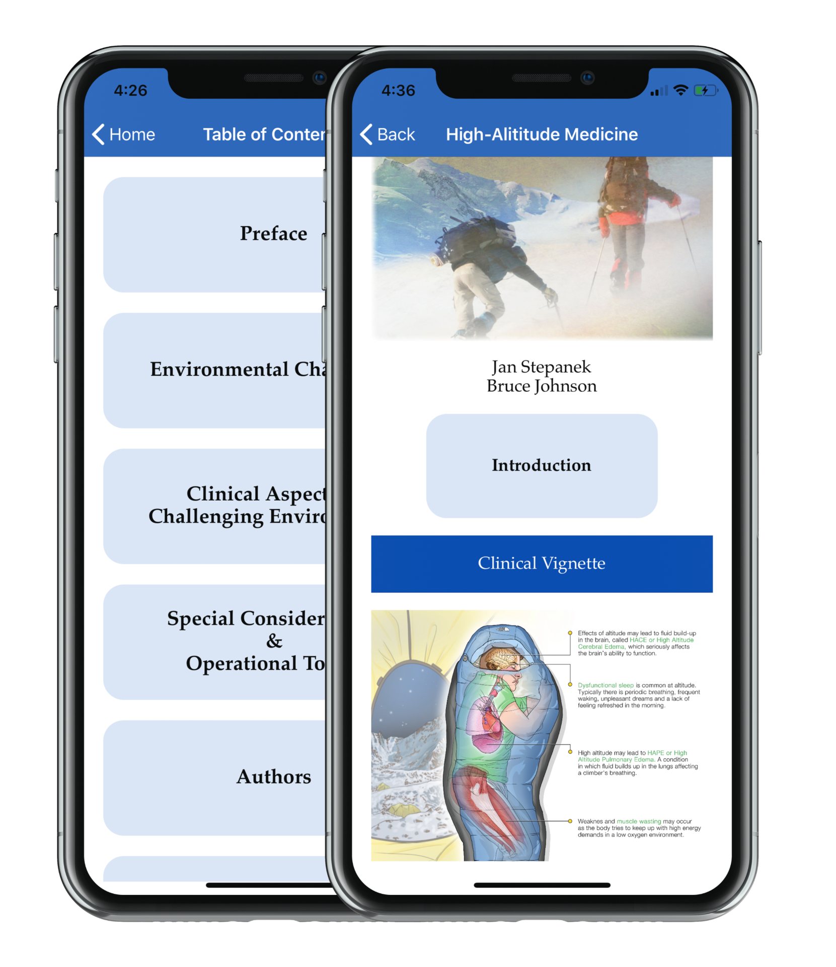 The purpose of this app is to impart practical, evidence based, multi-specialty medical knowledge to both medical professionals and individuals who desire to enter adventure activities or believe that they may need to know about these topics for their travels/ Our focus is to provide useful information in a dynamic, affordable, hand-held App format. This App may also be useful for the sophisticated adventurer both for planning and while en route. This work is a product of the tireless contributions by many practitioners in their respective areas of expertise. All of us on the editorial team are profoundly grateful for their willingness to share their passion, enthusiasm, and wisdom with our readers, who will appreciate the practical guidance provided.We are grateful for the expert assistance and contribution of our copy editors from Mayo Scientific Publications (Alissa Baumgartner, John Hedlund, Angie Herron, and Ann Ihrke) and Kenna Atherton, manager- Scientific Publications. We also acknowledge the excellent visual art created and formatted for this work by our media support services group artists and gifted illustrators Tom Bibby and Marvin Ruona. As editors we are grateful for the support of our colleagues, friends and most importantly the patience of our families, who have been supportive as we worked on this project ver many weekends and evenings.The advent of devices and systems that allow for effective presentation of video, text, and image content in a highly portable electronic form has been the incentive to embark on the project to assemble the wide breadth of this work. The work before you encompasses areas of Wilderness Medicine, Aerospace Medicine, Emergency Medicine, Pediatrics, Internal Medicine, key concepts of Survival, Psychology and many other clinical specialty areas of expertise in the civilian and military realm. We hope this reference will serve the provider and interested public as a resource at the point of need in challenging environments.This reference application will be updated on a regular basis and content will be added in future releases of the App as user need dictates.The app is organized into three main sections, comprised of standard chapters and a keyword search capability for retrieval of pertinent information.We are very interested to hear from our users, so we can continually improve the content to best serve the needs of our readers.It is our hope that with this approach we can bring additional information to where it is needed, following the primary value of the Mayo Clinic:"The needs of the patient come first"